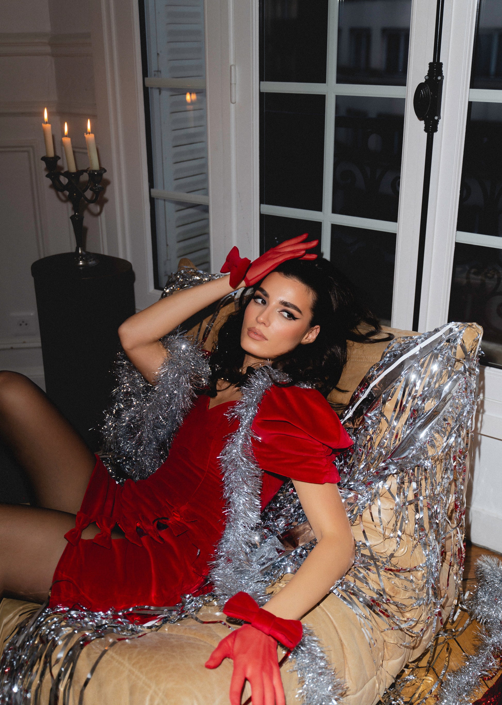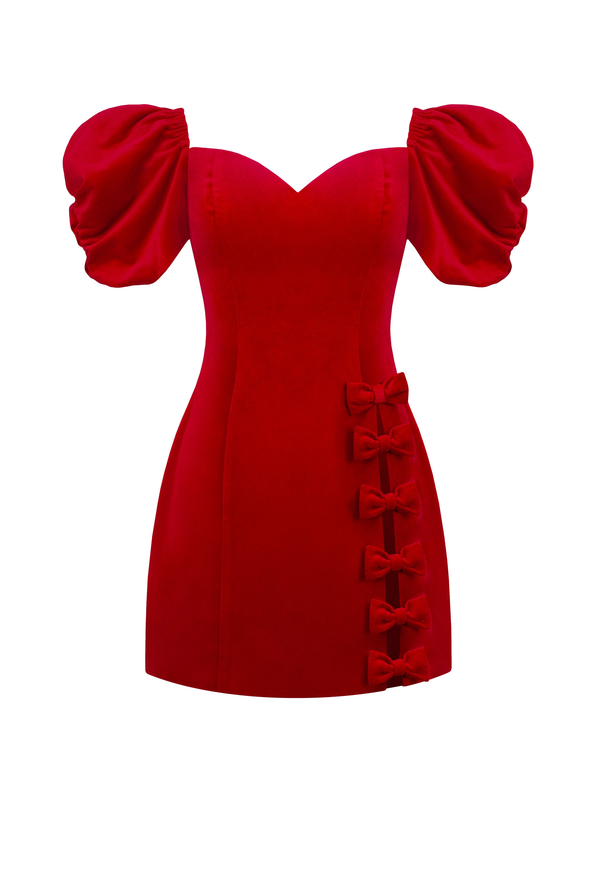 A red velvet mini dress with a figure-hugging silhouette and transformable accent sleeves that can be worn in two variations: voluminous puff sleeves in a classic on-shoulder style or elegantly off the shoulders.