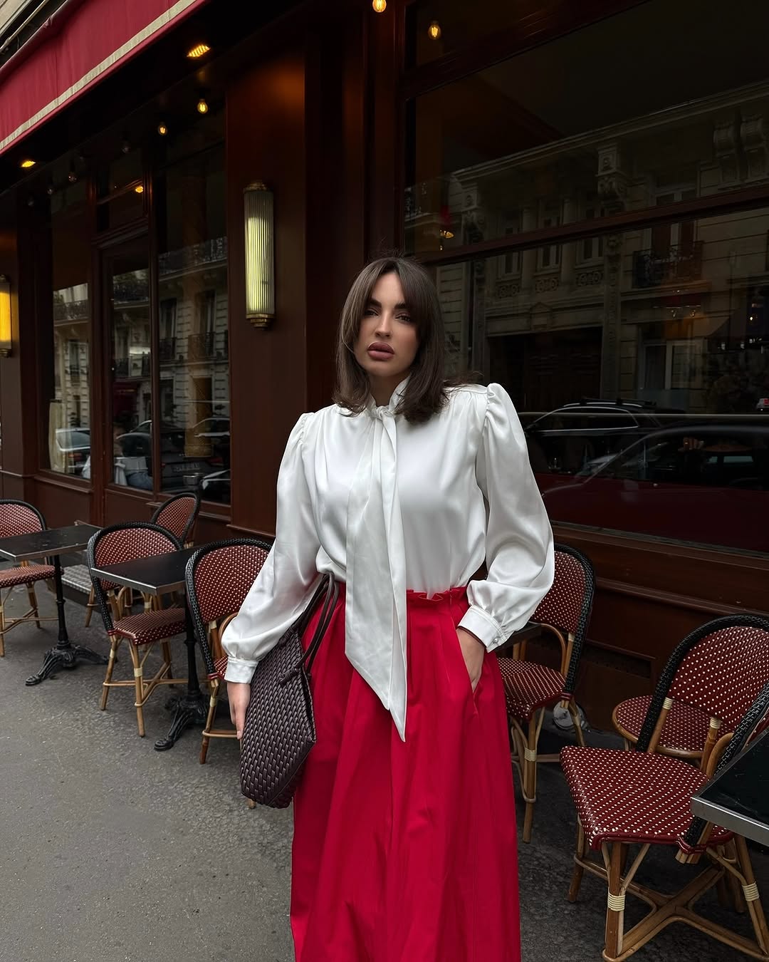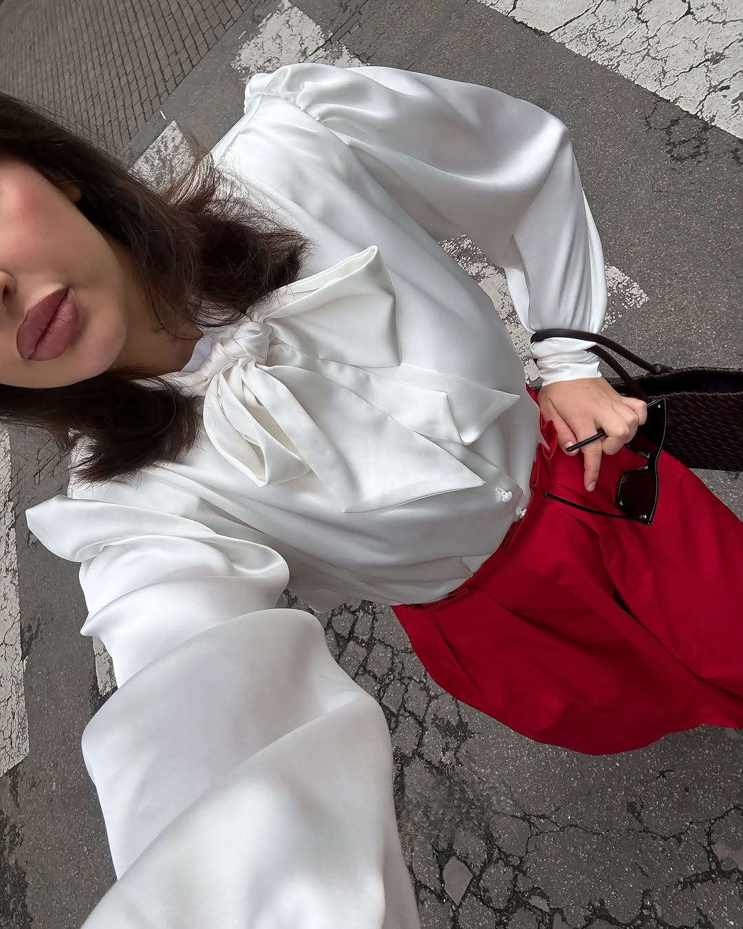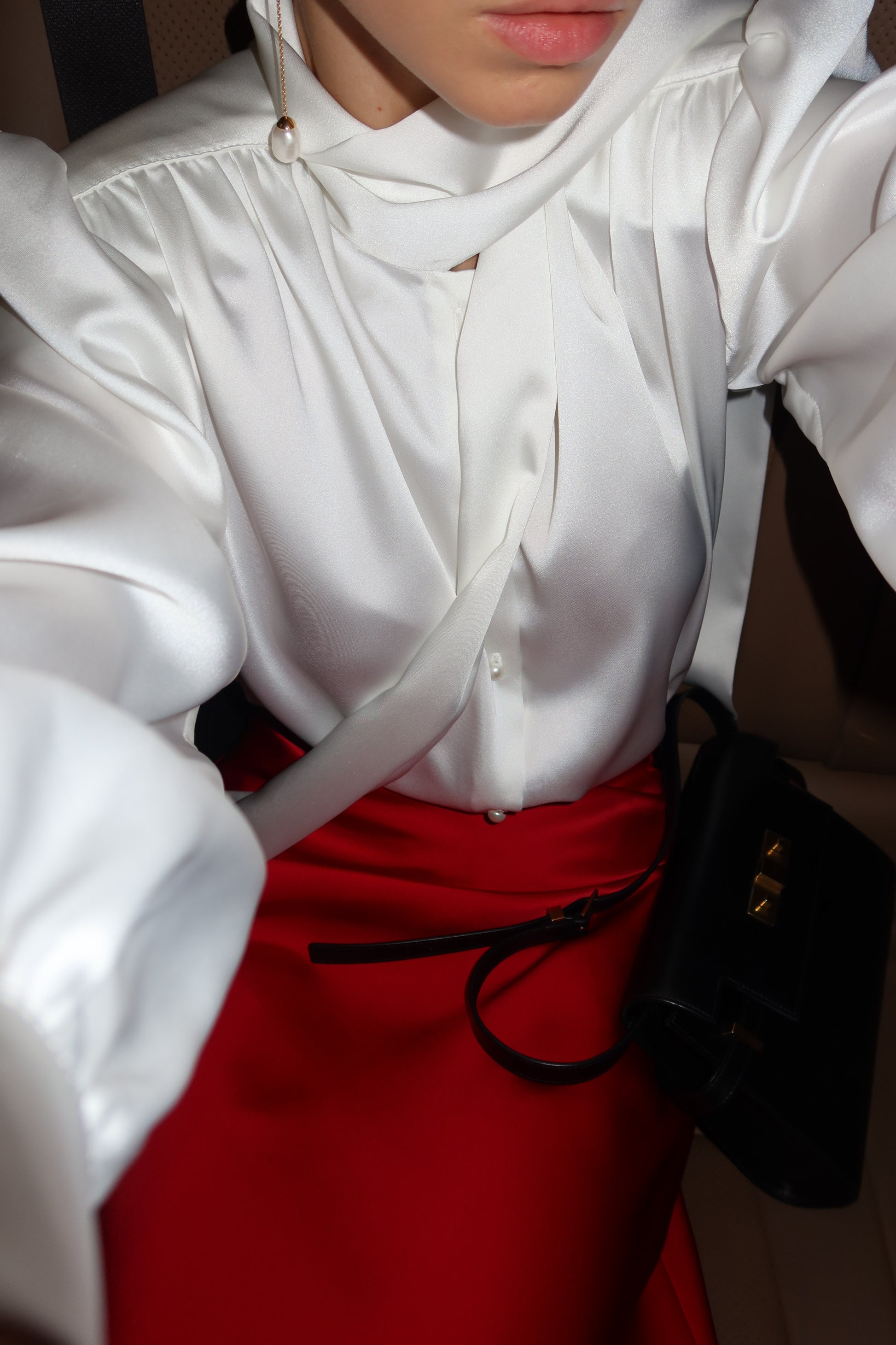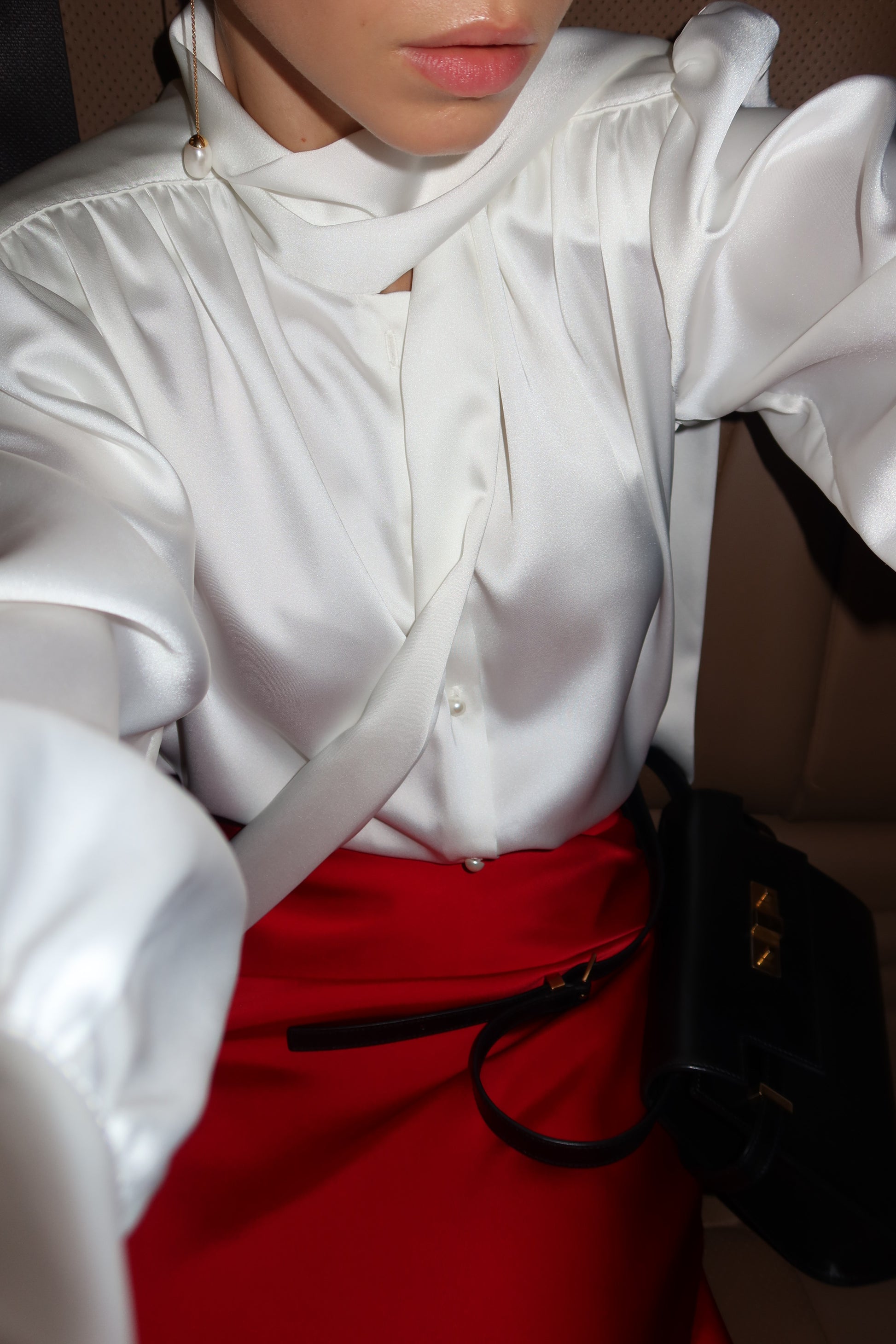 The main highlight of which is the scarf element, which can be beautifully tied in a bow or left untied as a light thin scarf, which is also a trend of this season.