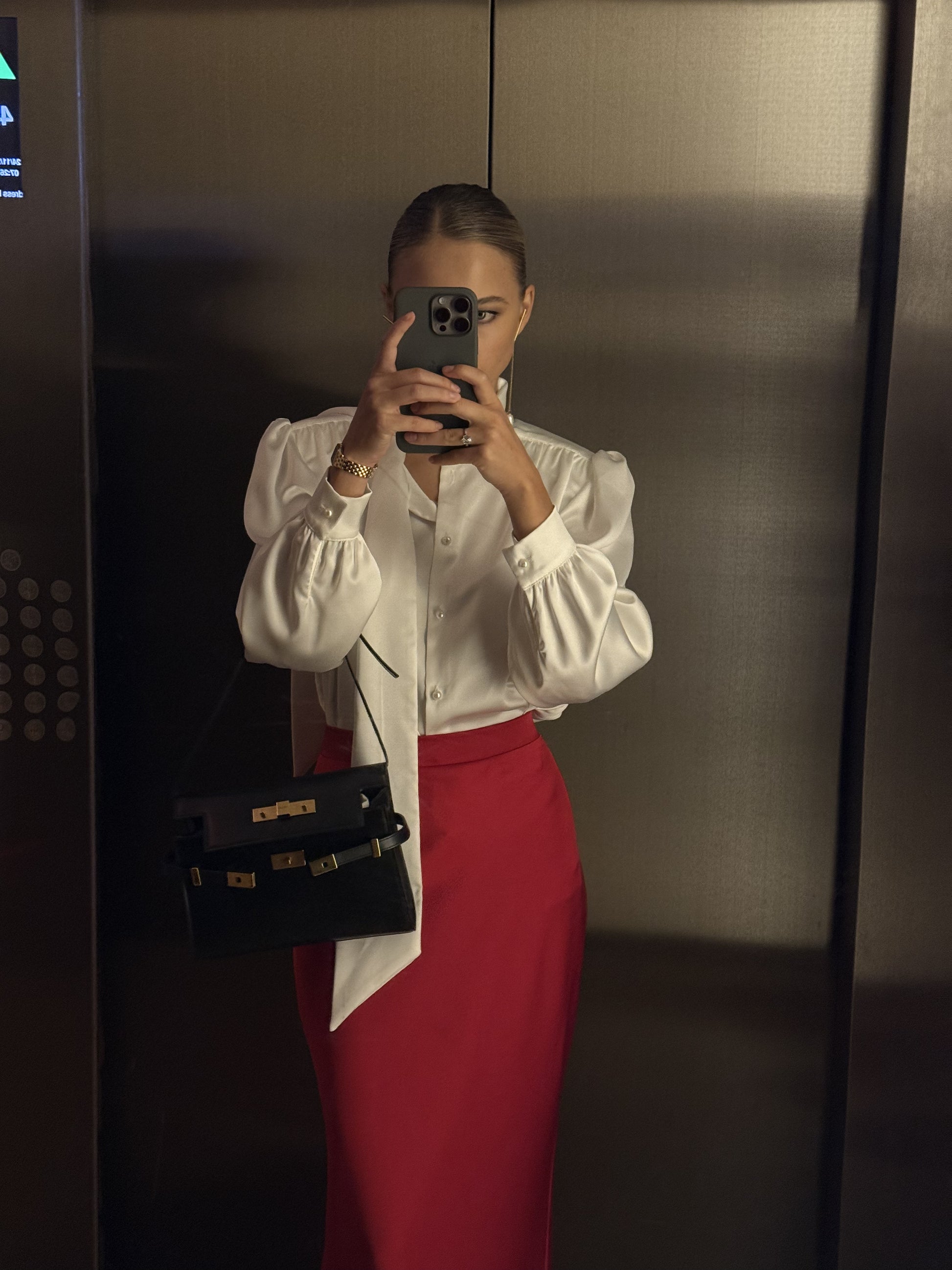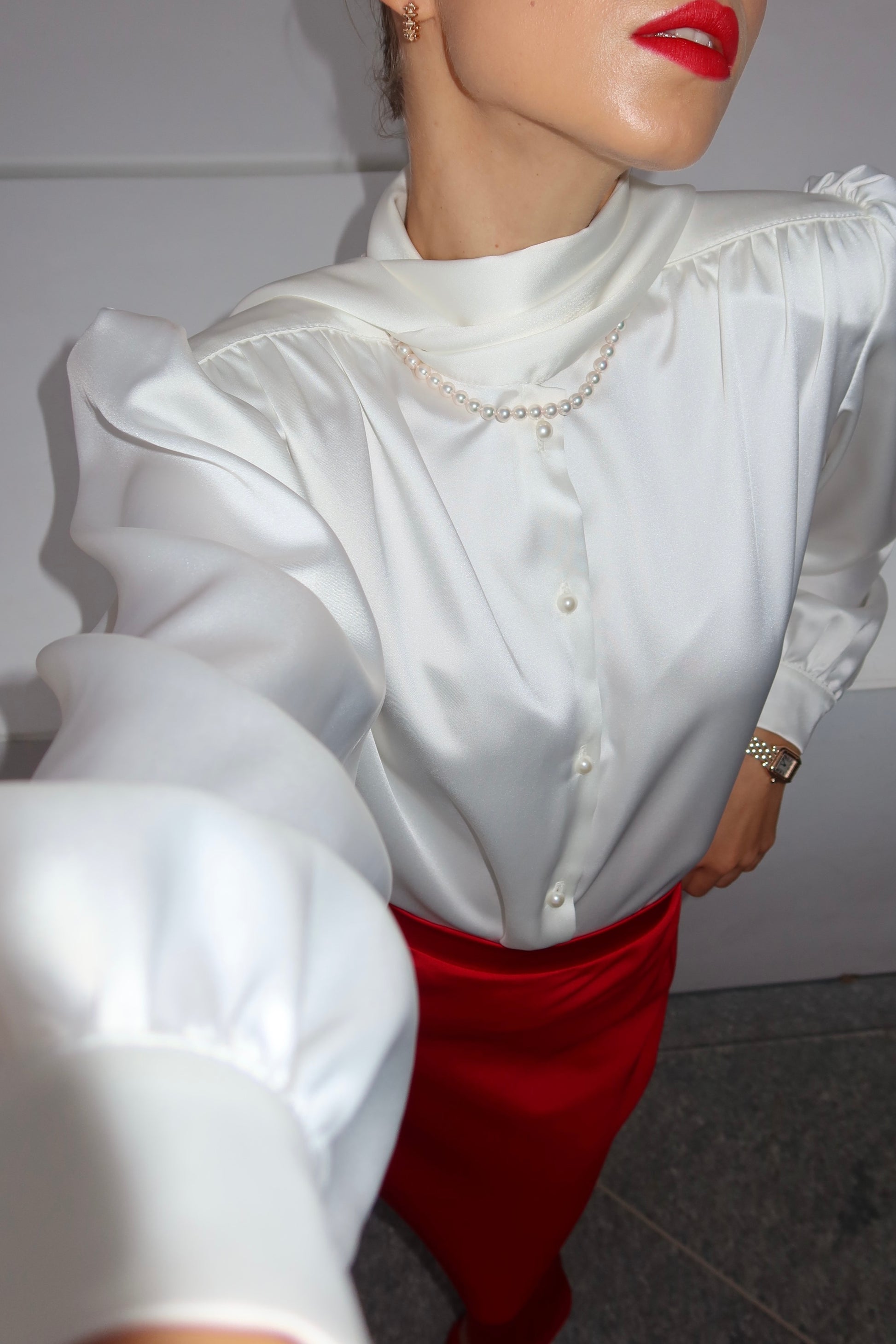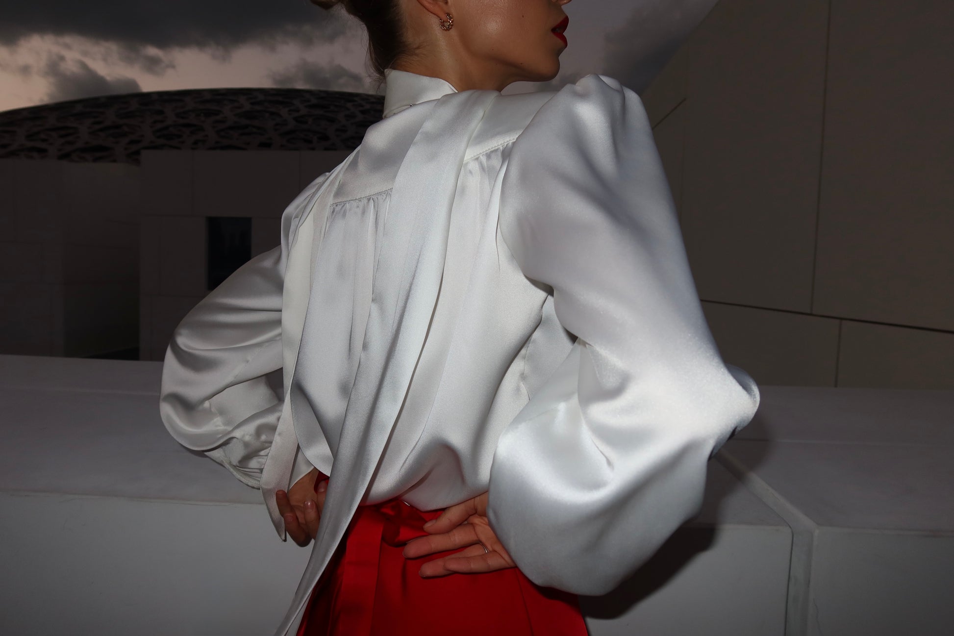 The main highlight of which is the scarf element, which can be beautifully tied in a bow or left untied as a light thin scarf, which is also a trend of this season.