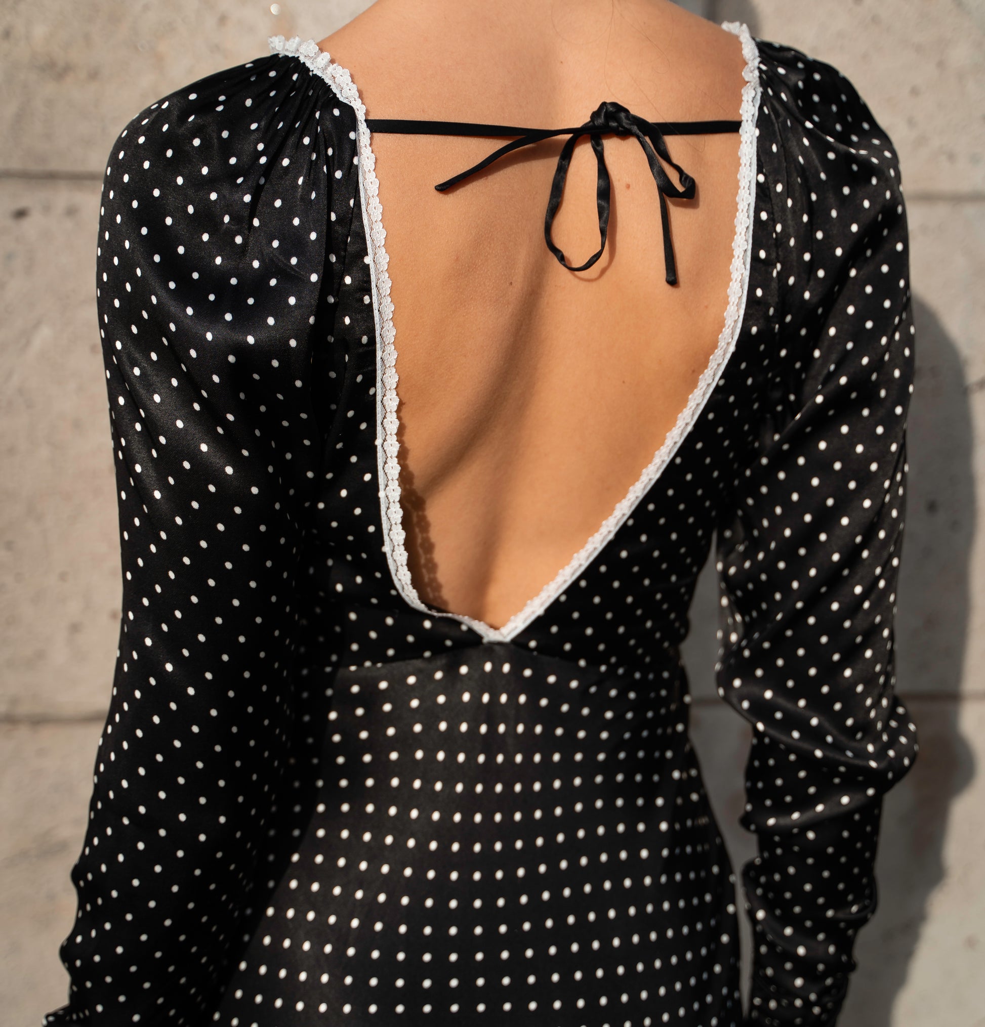 Crafted from a refined viscose–silk blend (50/50) and adorned with delicate Italian lace, the dress offers a luxurious, soft drape.