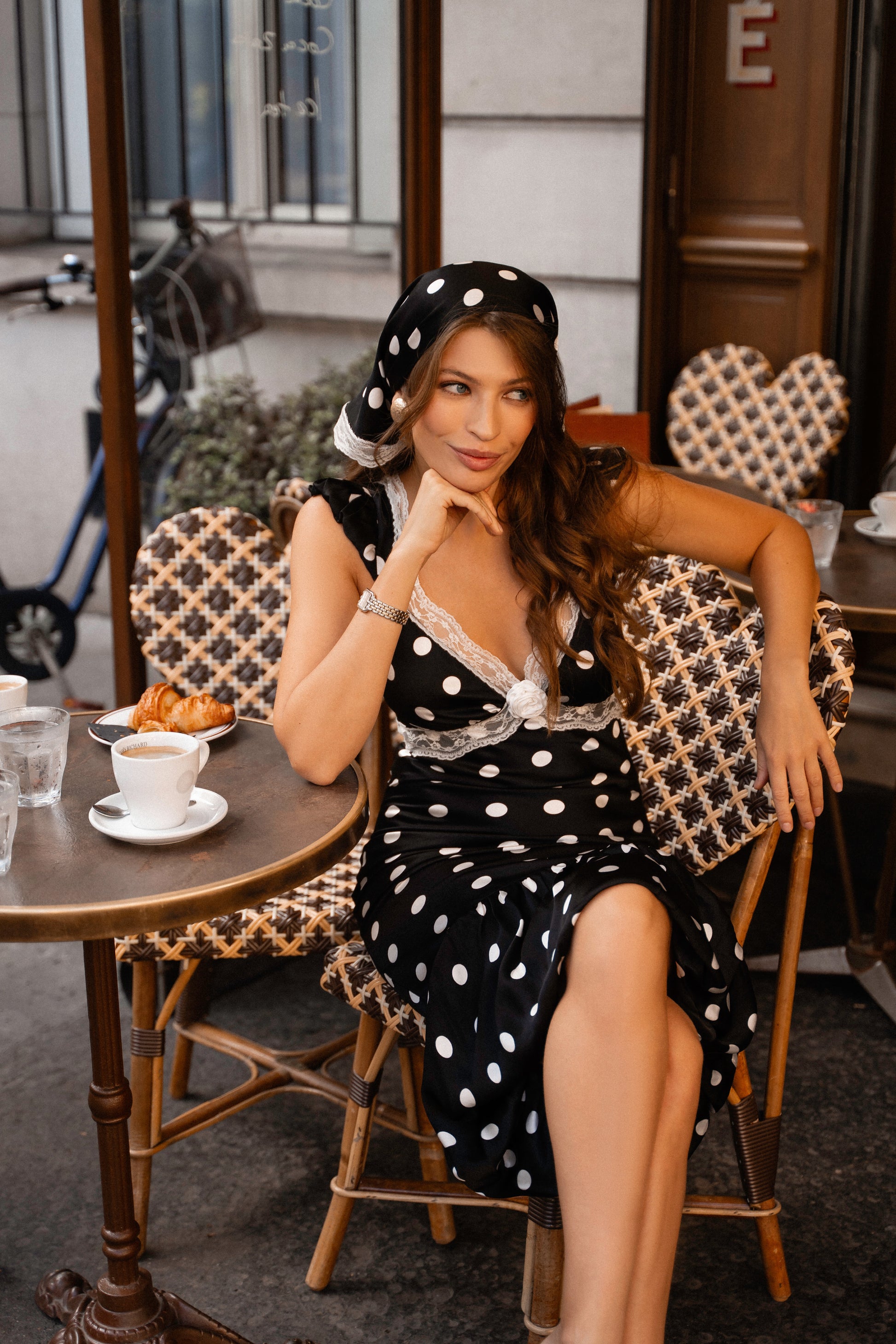 Dress “Daphne” - midi length, fitted silhouette with accent on the waist and soft valance at the bottom. Made of 100% viscose, decorated with Italian lace. Deep V-neckline on the chest is decorated with a lace insert and a small handmade rose. On the shoulders there is a gathering with a ruche. The back is completely open, with a shaped line edged with lace and a tie at the neck. Available in two versions: milk ivory and black with white polka dots.