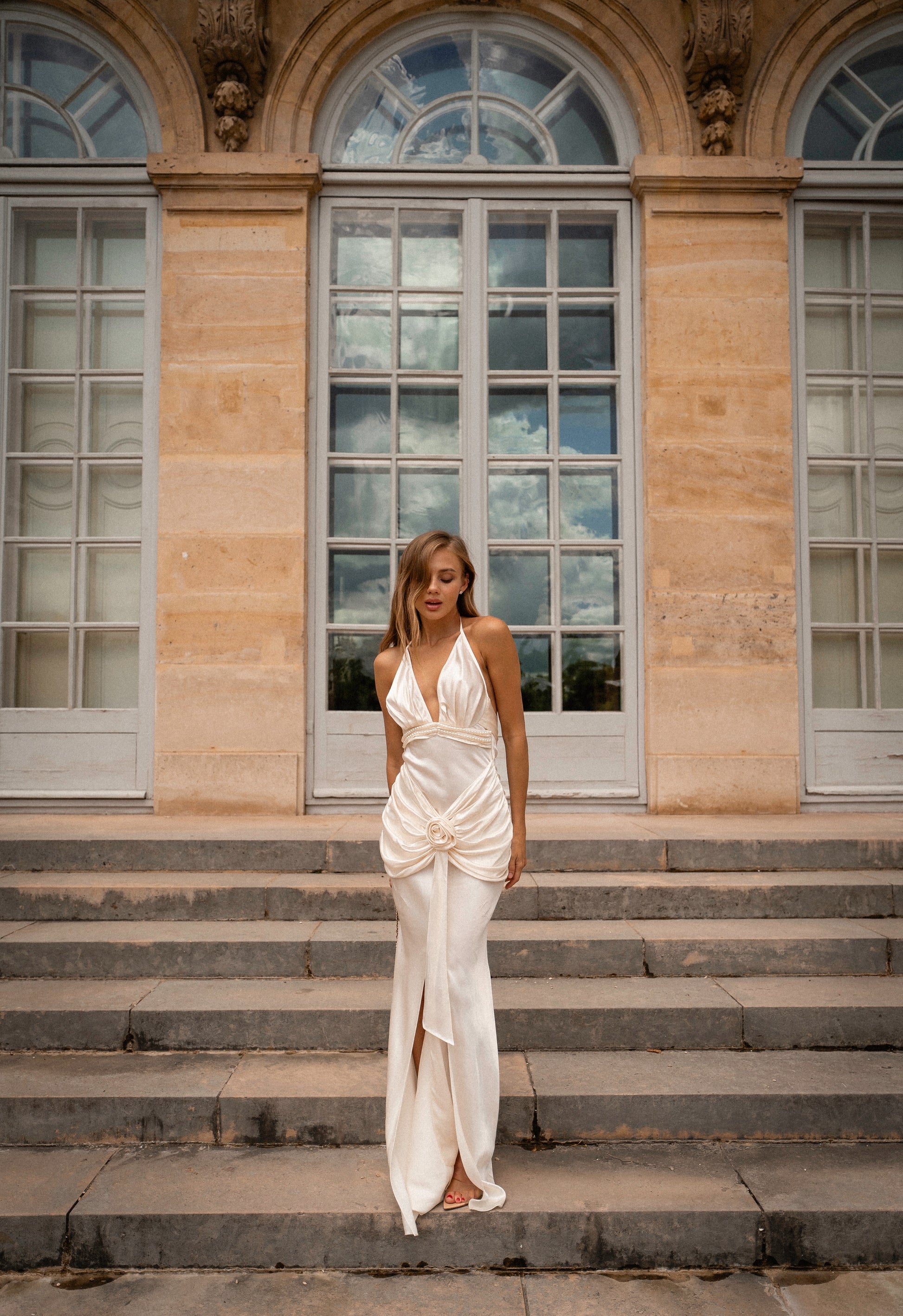 The “Grace” dress — floor-length with a fitted silhouette that emphasizes the bust and waist.