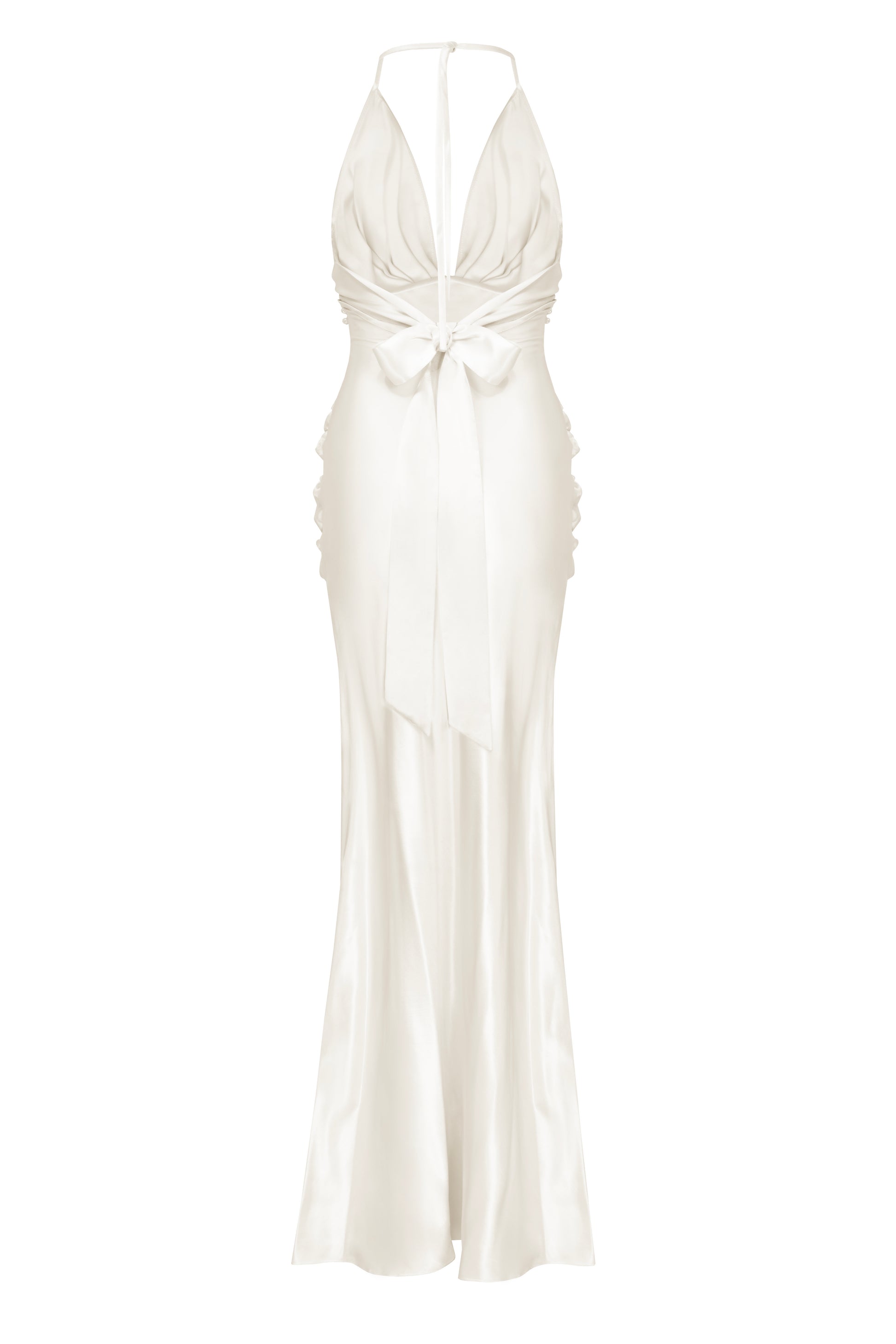 The V-neckline highlights the décolleté, while the gathered hip line elongates the silhouette.