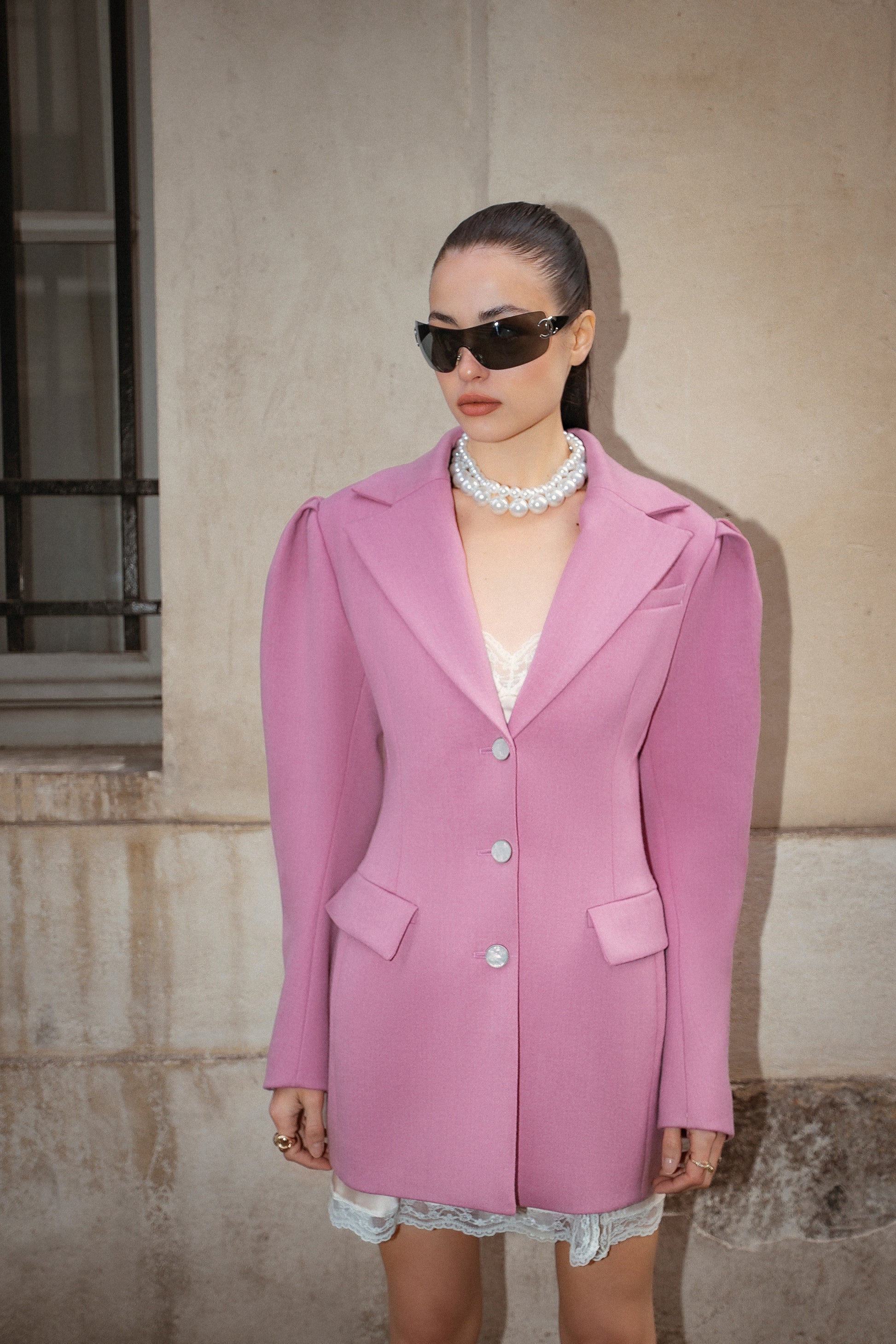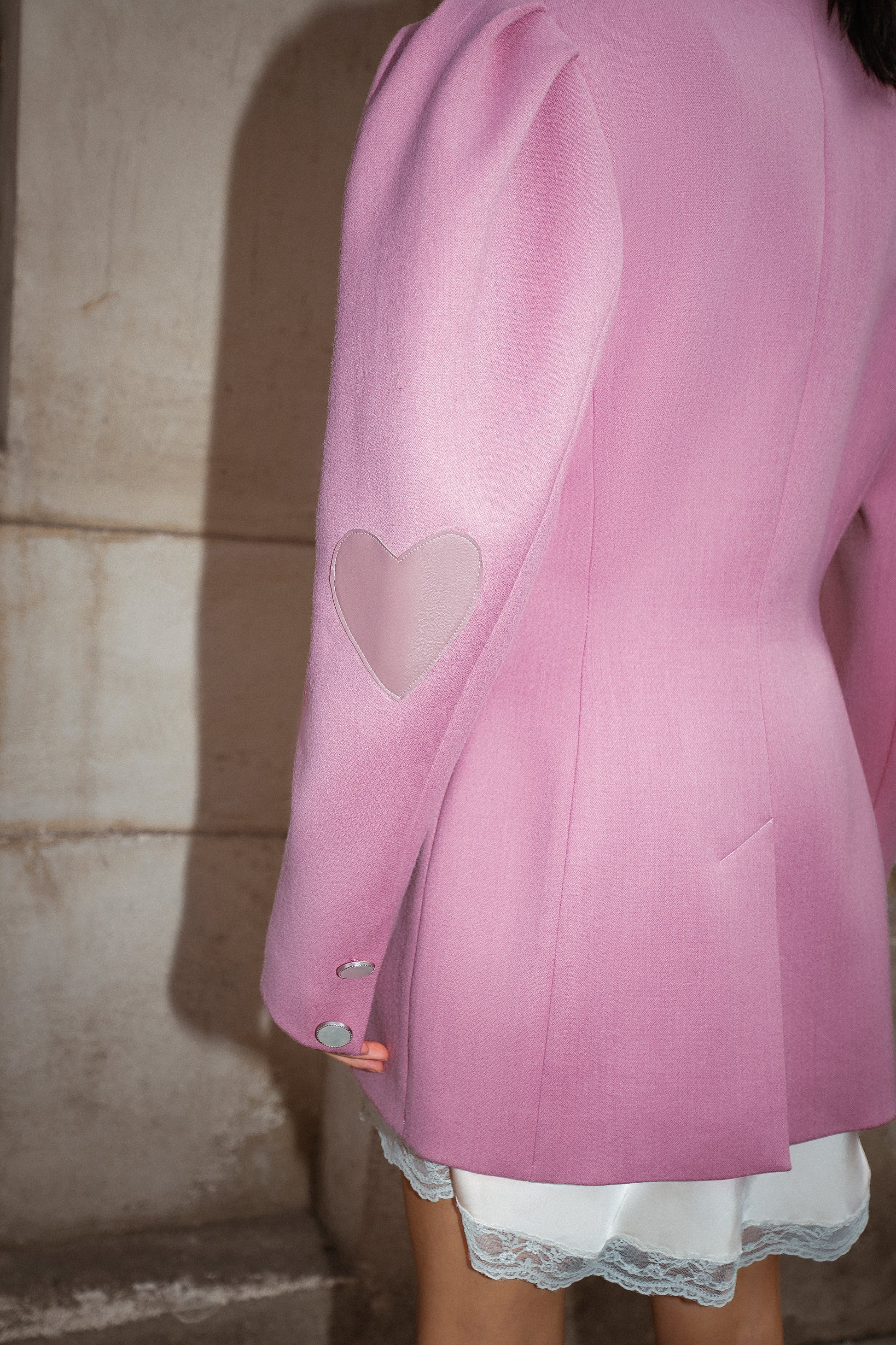 Pink single-breasted jacket of fitted style, accentuates the waist. Long sleeves are decorated with eco-leather hearts on the elbows. Pearl-marble color buttons with silver edging on the pink jacket.
