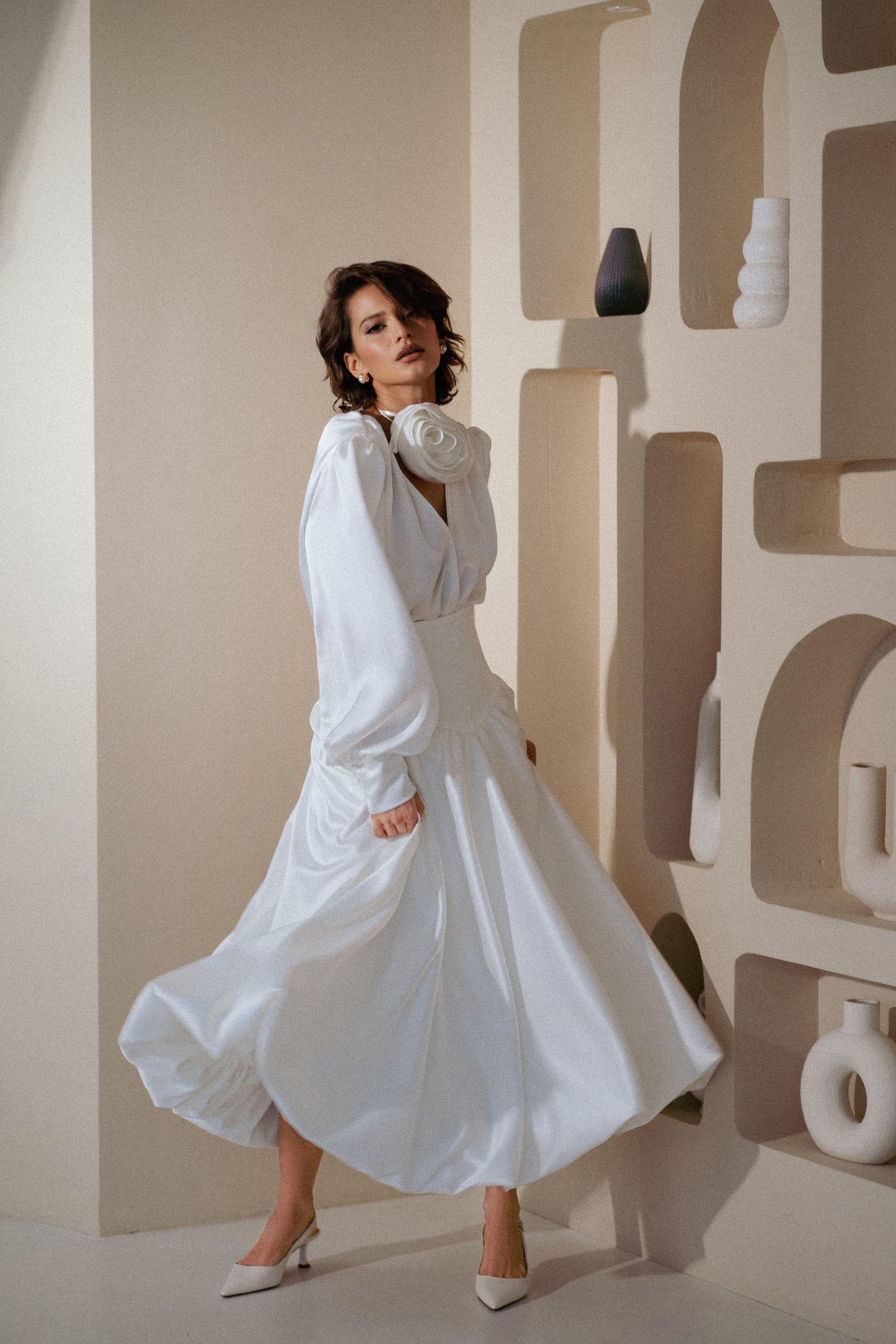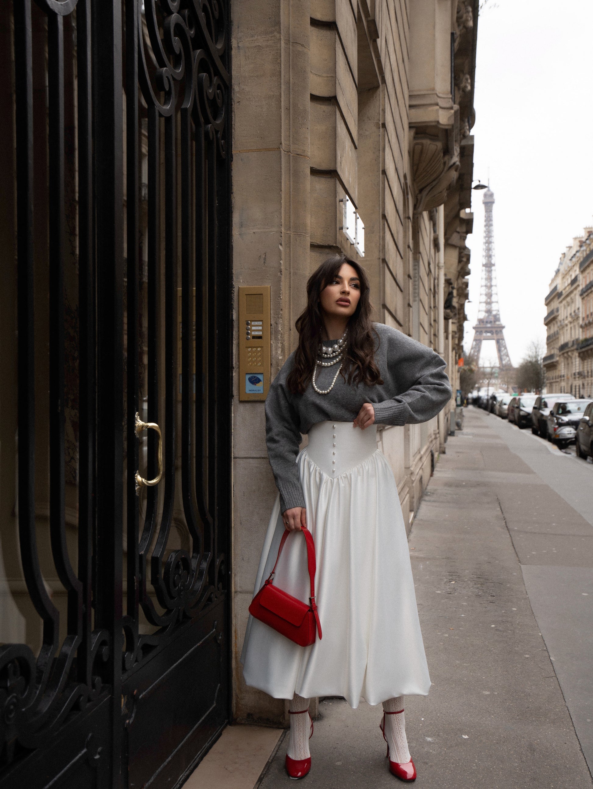 Midi length balloon skirt in a high fit with accent waist in Italian sateen. It holds its shape well. The waist in the front is decorated with pearl beads, and in the back is made on the principle of a corset, tightened on the lacing under your waist. The skirt comes with two pairs of ribbons with bows of different colors, which can be put on the skirt through loops from the top and bottom.