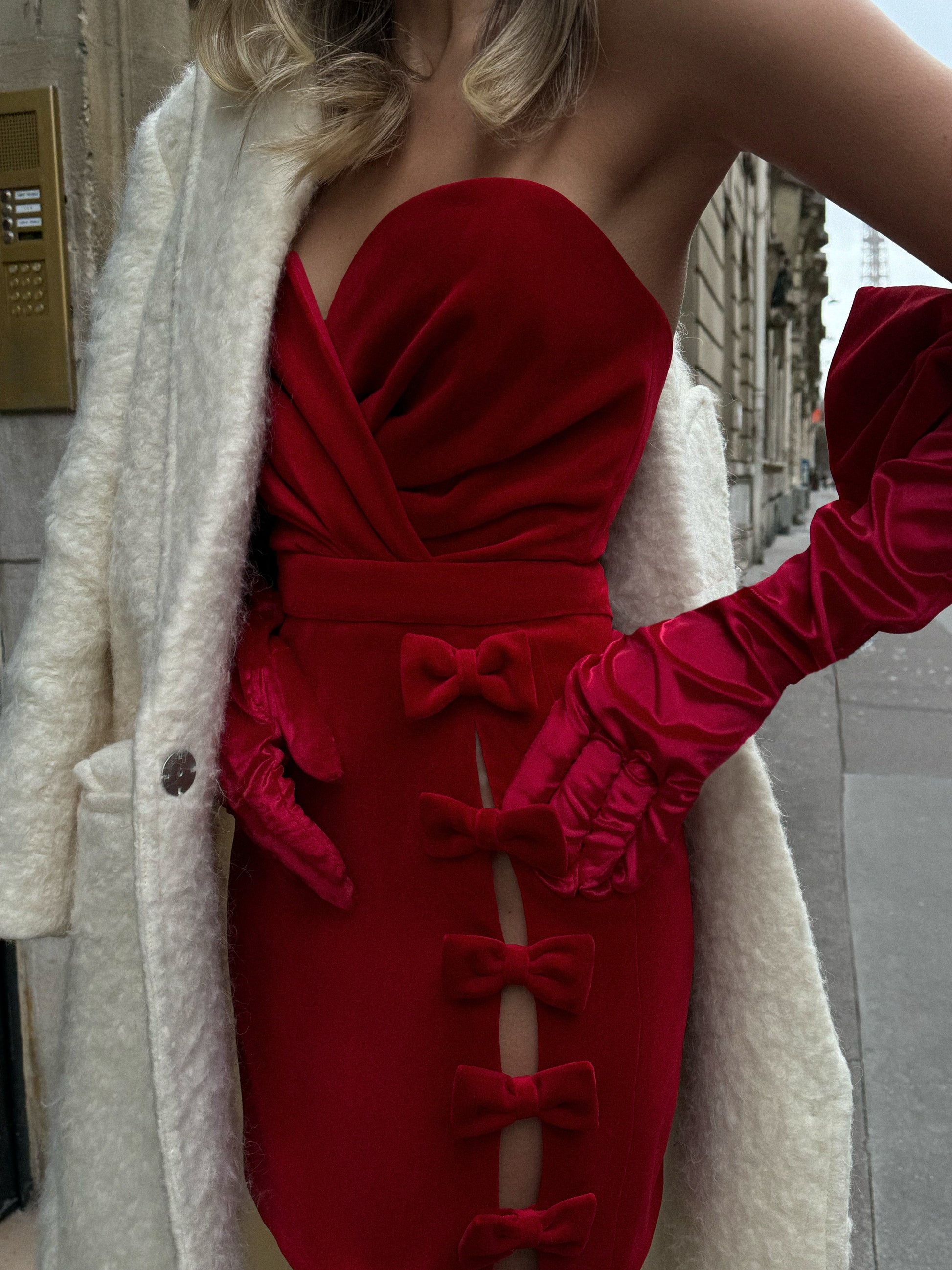 Mini length velvet dress of fitted silhouette with a side slit decorated with bows.