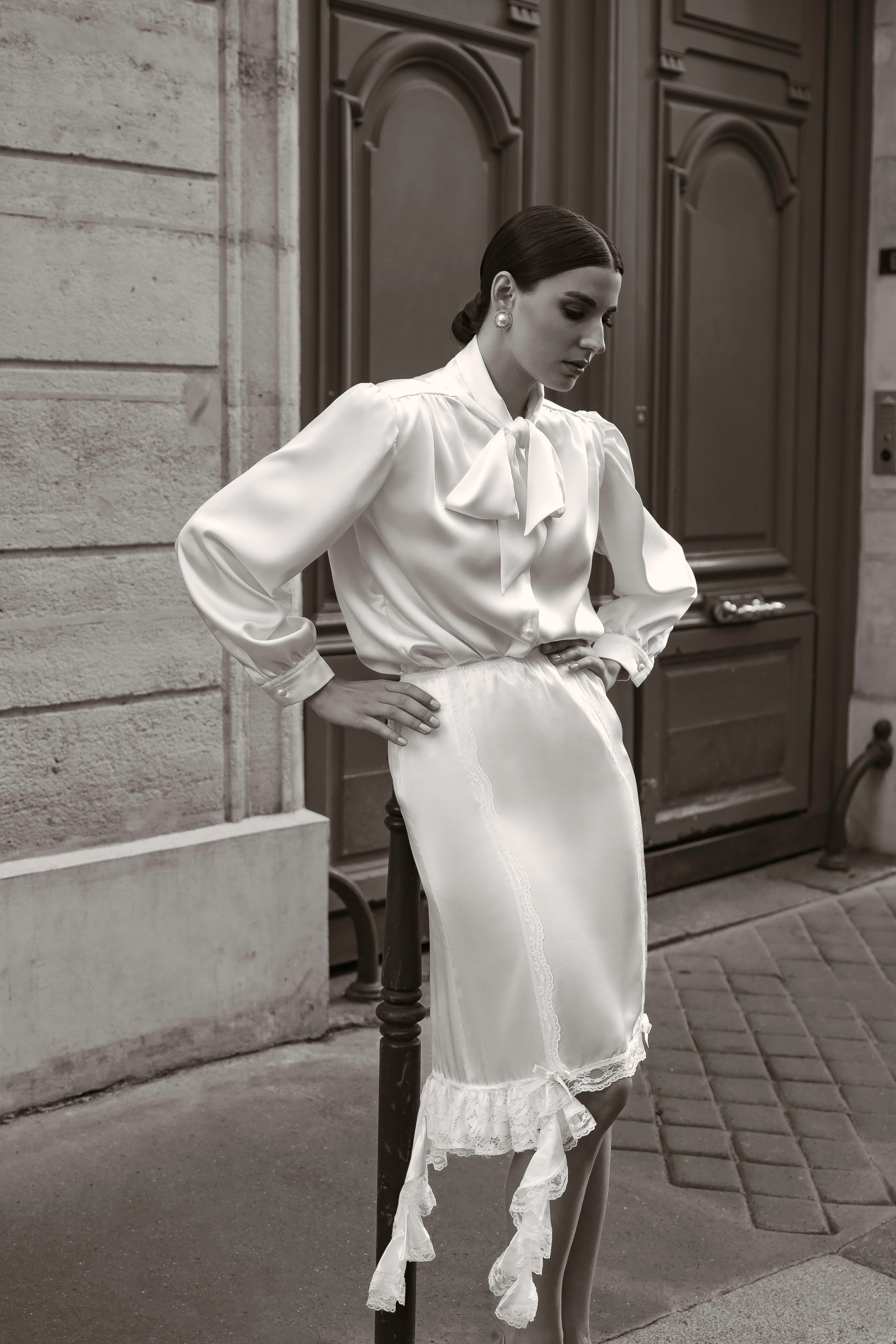 The Colette Midi is defined by its high-waist fit and soft drape. Vertical lace inserts refine the figure, while the arched hemline with ruffles and lace detailing creates graceful motion. The asymmetric ties add a touch of romance, evoking the sensual charm of boudoir-inspired style. The midi length elongates the silhouette, making it perfect for both everyday chic and evening occasions.